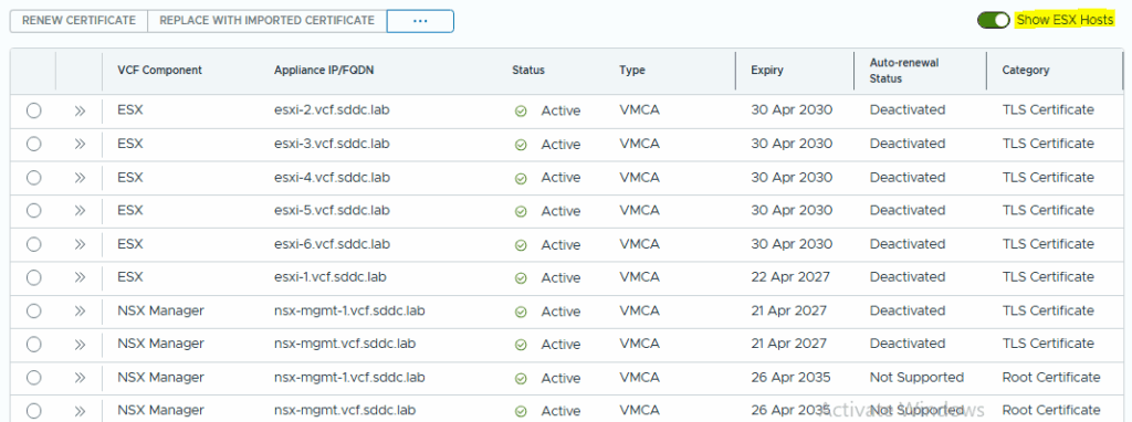 To see the ESX certs, we browse to the VCF Domain and select “Show ESX Hosts”