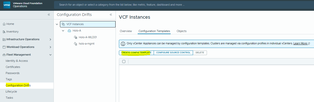 Log into VCF Operations and browse to Lifecycle / Configuration Drift