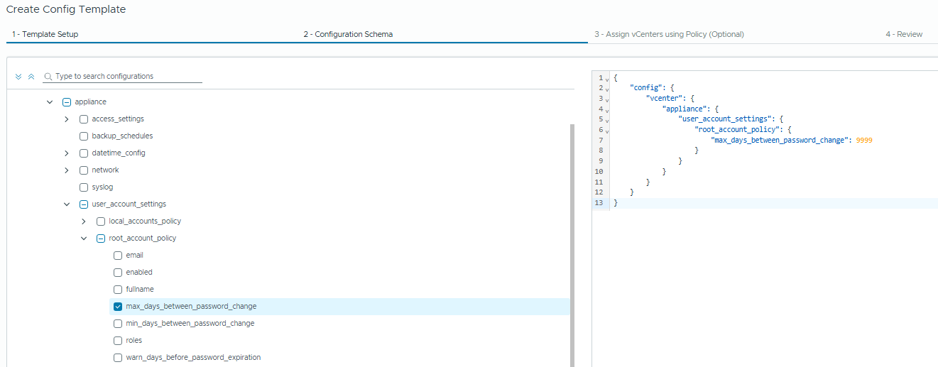 Click Next and we’ll see the screen to configure the template. I’m going to create a very simple example here to push out the root password expiry policy to 9999 days, as this is a lab environment.
