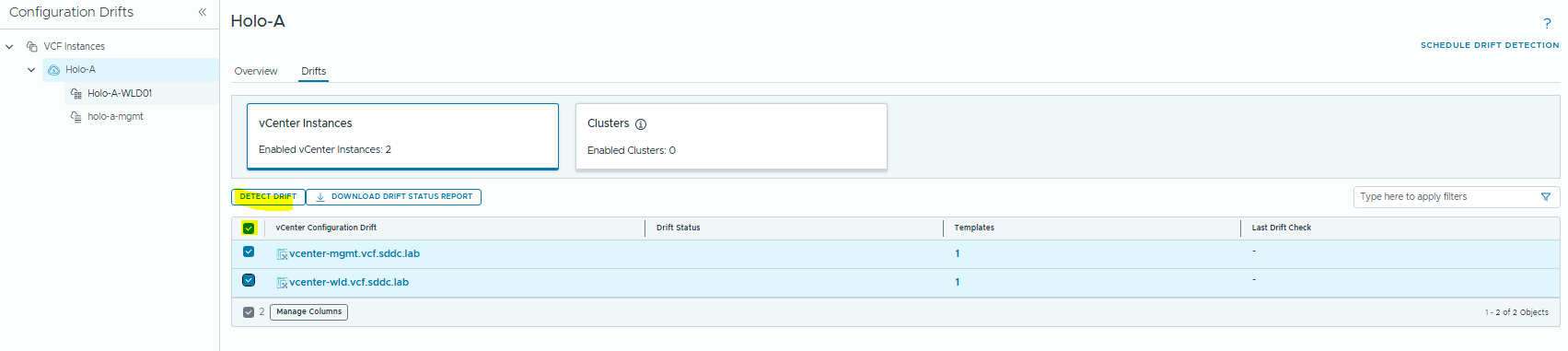 Select the two vCenters and click Detect Drift.