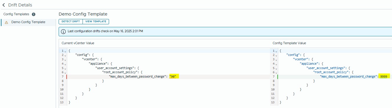 After the Drift Detection runs, we can click on the vCenter to show the results.