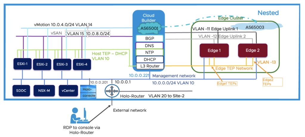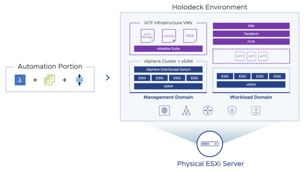 My posts mention Holodeck a lot, if you’ve been living under a rock and haven’t come across this yet, it provides a mostly automated method to deploy a fully functional VMware Cloud Foundation (VCF) lab with reduced hardware. You can deploy a full nested VCF stack on a single (beefy) host, which make it much more accessible than the 4 host+vSAN minimum required for a VCF Management Domain.